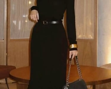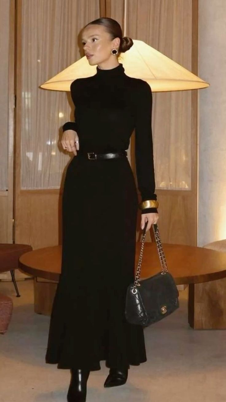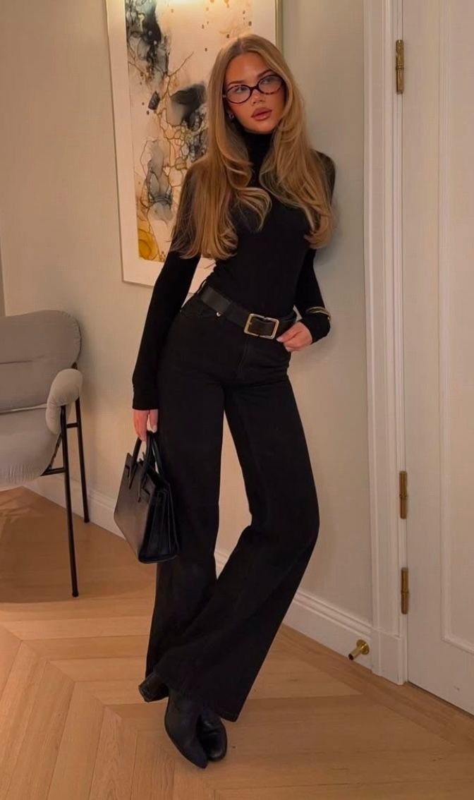 The allure of an all-black outfit is timeless. Combine tailored black trousers with a sleek turtleneck or a fitted black top for a streamlined silhouette. To elevate the elegance, incorporate a sophisticated belt to define your waist. Footwear can be a pair of minimalist ankle boots or refined flats, ensuring comfort without sacrificing style. Accent your outfit with subtle gold or silver jewelry to add a hint of shine, maintaining an overall chic and clean aesthetic. This look is perfect for evening gatherings or dinner dates.